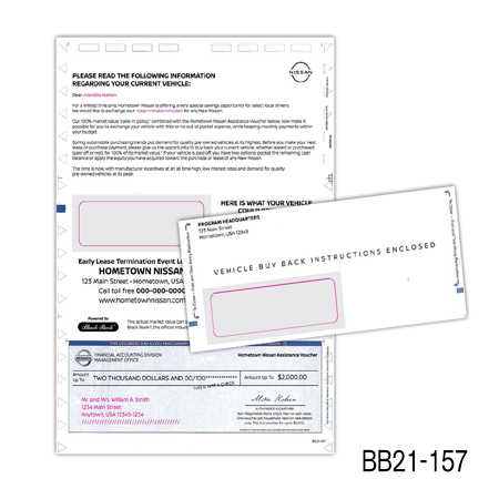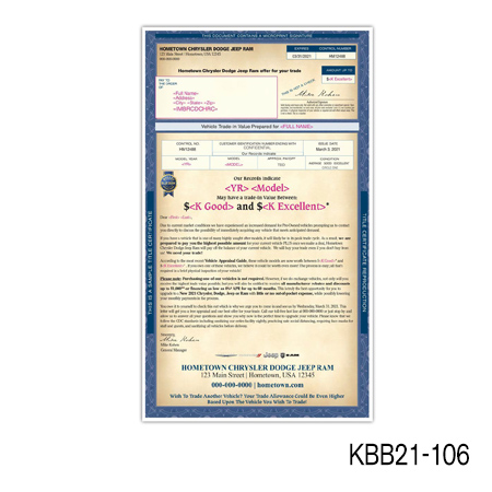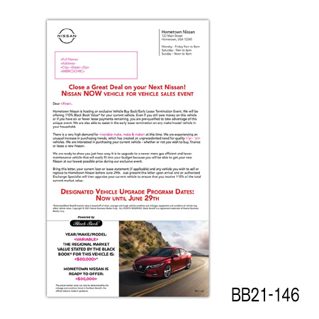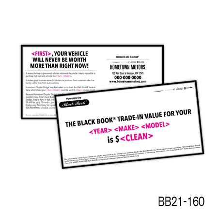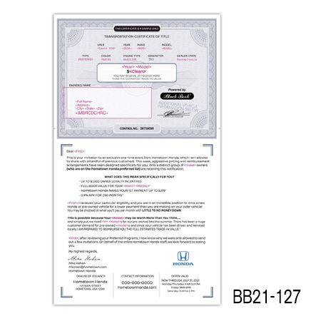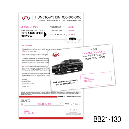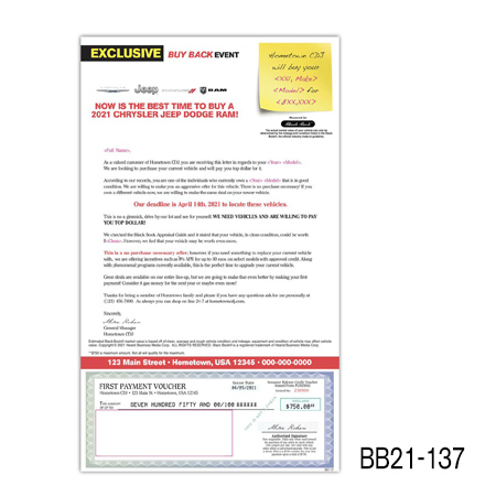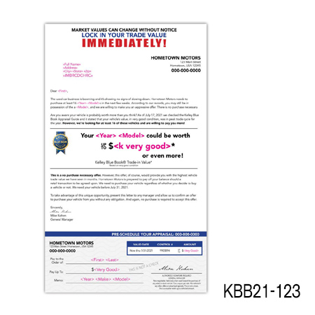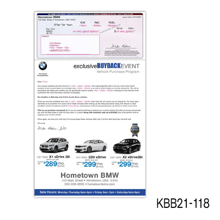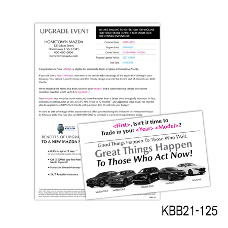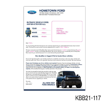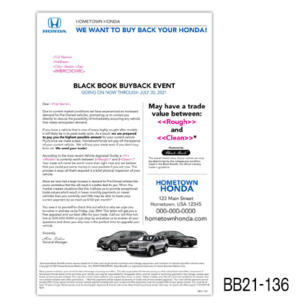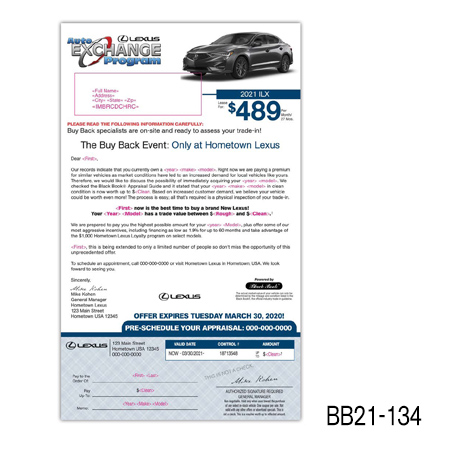 the current value of their vehicle is subject to mileage and condition. Buy Back/Trade-in campaigns are more successful when you include the combination of the prospect’s car year, make, model, and trade-in value.